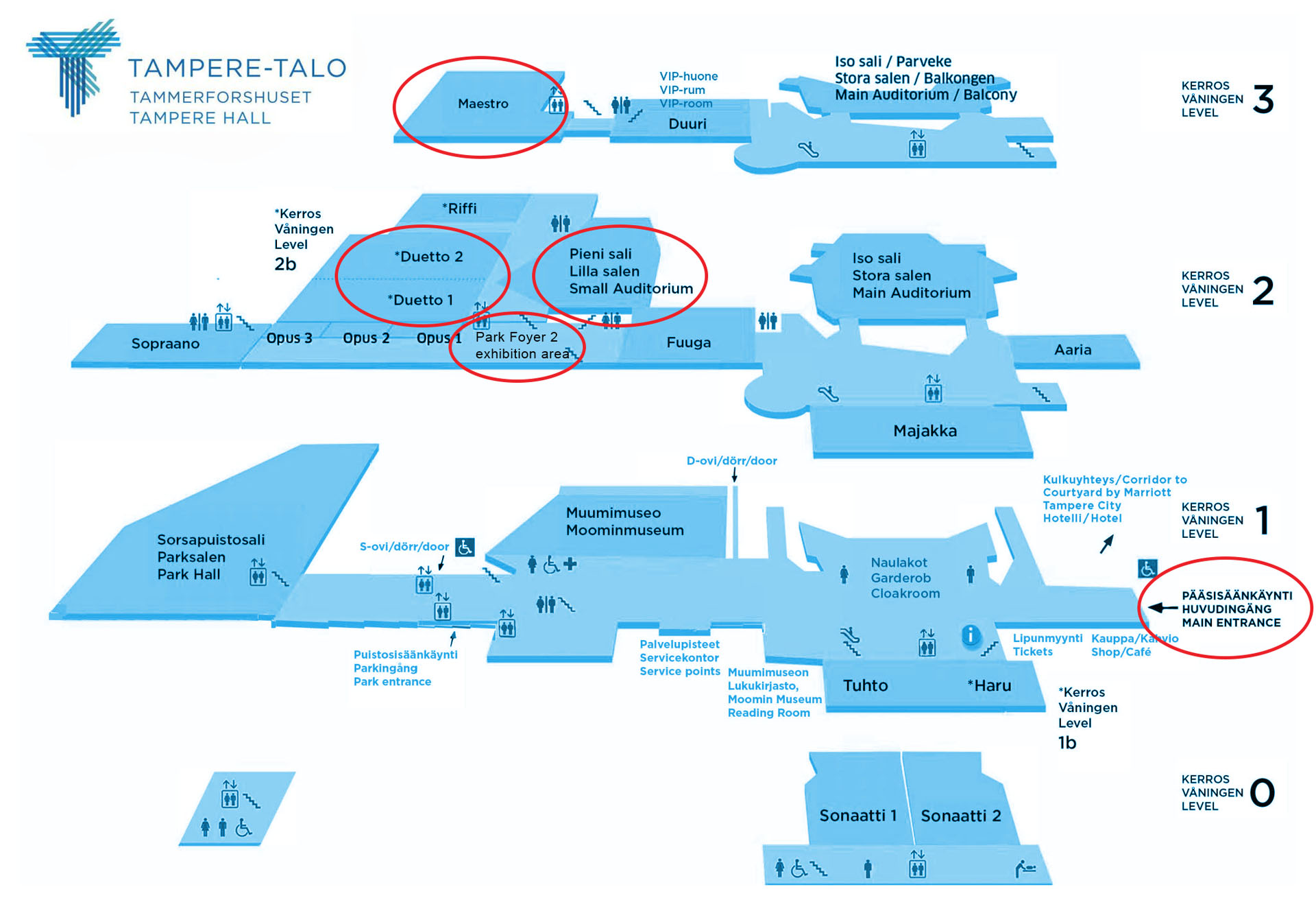 IPA-23 conference will take place in three auditoria of Tampere Hall: Small Auditorium (500 seats), Maestro (235 seats) and Duetto (390 seats). The exhibition is arranged in Park Foyer 2, which is right next to the entrance of Small Auditorium.